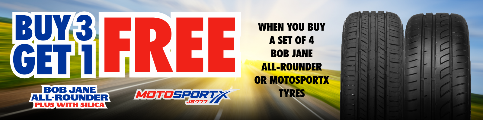 The offer is valid from 12:00am AEDT Wednesday 1 April until 11:59pm Thursday 30 April 2026 AEDT. Receive the fourth (4th) matching tyre free with the purchase of three (3) Bob Jane All Rounder or MotoSportX tyres in one single transaction. This offer is redeemable in store or online only at time of purchase. A standard $25 (inc GST) fitting, balancing, tubeless valves (excludes Tyre Pressure Monitoring Systems) & tyre disposal fee applies on the free fourth (4th) tyre. Strictly no rainchecks, offer is valid while stocks last. In case of a staggered fitment the fourth (Free) tyre must be of equal or lesser value. Offer excludes Government and Wholesale purchases. Not available with any other offer.