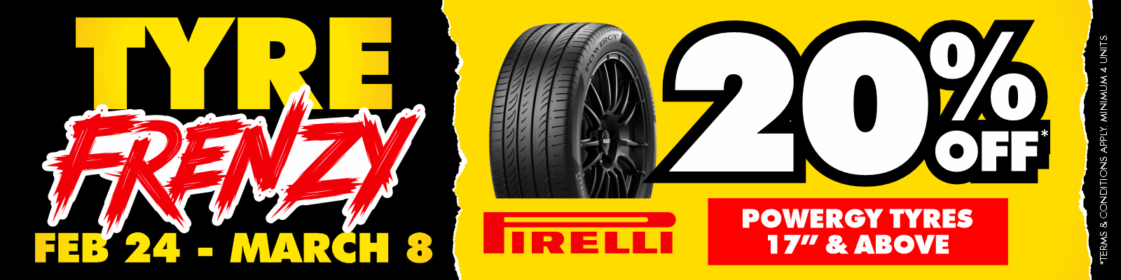 Get 20% off* when you purchase a minimum of four (4) current, in stock Pirelli Powergy tyres 17” and above, in a single transaction, purchased in store or via the bobjane.com.au website displayed as Tuesday 24 February until Sunday 8 March 2026.